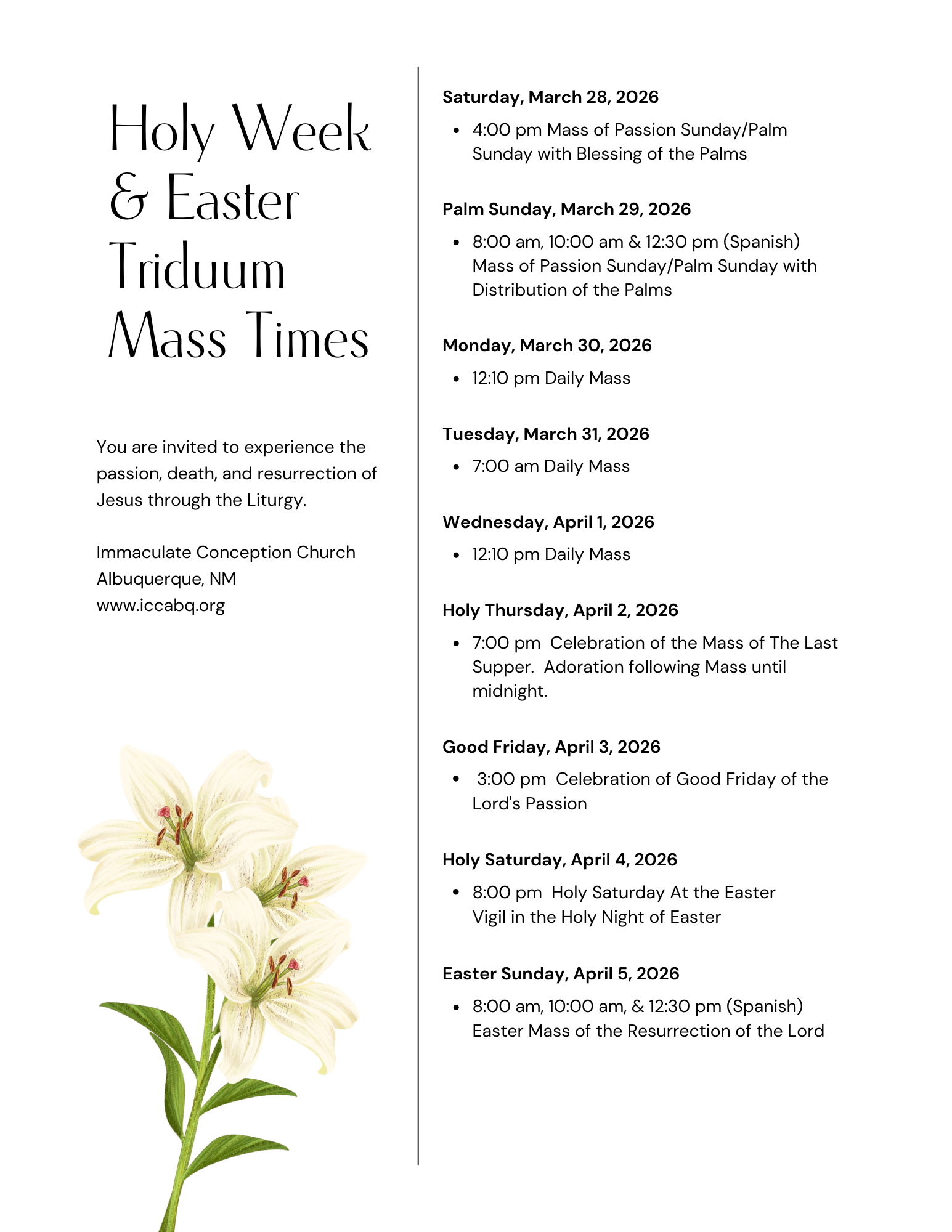 Sunday: 8 AM, 10 AM, 12:30 PM Spanish